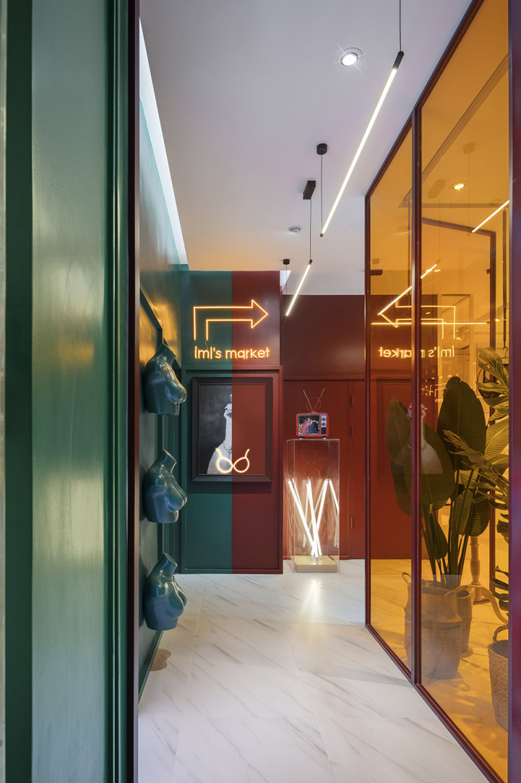 將內衣店偽裝成秀色可餐的水果店,讓人垂涎欲滴,整體色調偏暗,通過霓虹燈管的照射,裝飾畫的鋪墊,營造一種電影特效大片的感覺。設計師加入橘黃色的亞克力片很好的中和了整體色調,空間層次感十足,綠植盆栽的裝飾為空間增加些許生機。
