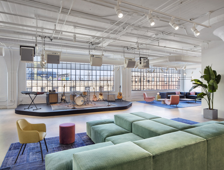 從圖中我們可以一眼看出這是一個音樂類型的藝術辦公室,采用木制式的看臺座位,可以方便后期企業舉辦各種形式的音樂會、發布會和行政會,也能方便員工和顧客觀賞。頂部通過參差不齊的吊燈既能滿足必要的照明需求又能起著裝飾作用,增強美觀。