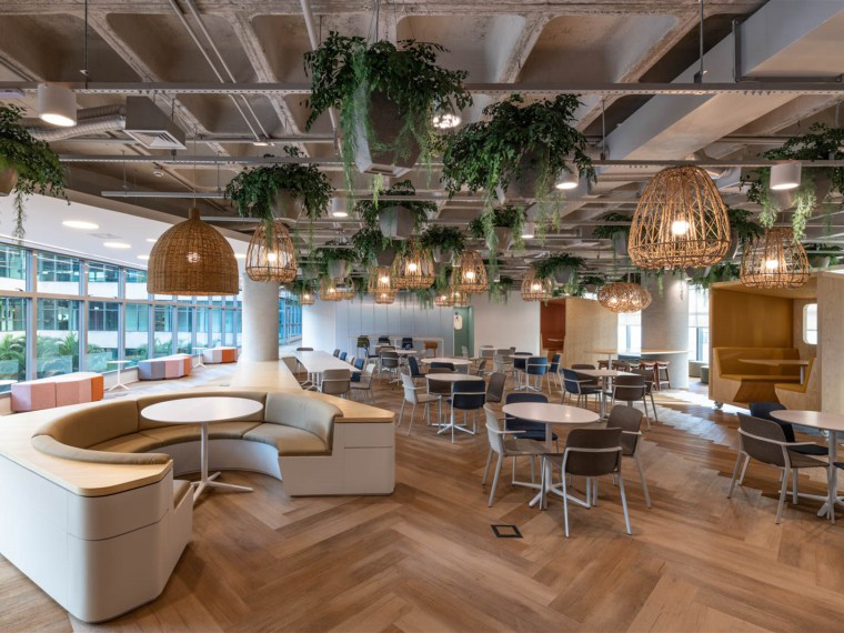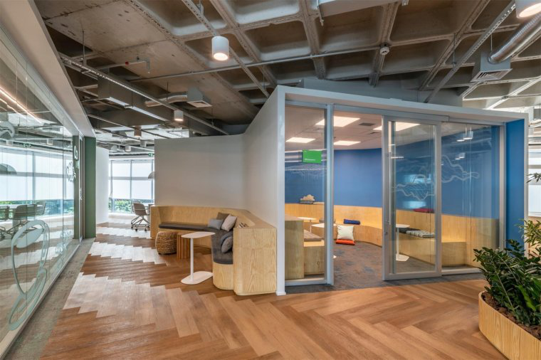 這家旅行社給人的第一印象是不是感覺生態氣息十足呢?接待室采用淺色系的木質地板進行鋪設而成,木質地板更貼合原生態,也符合旅行社的主題設計。頂面保留原始的建筑結構,在搭配懸掛的綠植,給人身臨其境的美感,木質燈框像一個鳥籠一樣包含在內,就像是回到了原始森林。